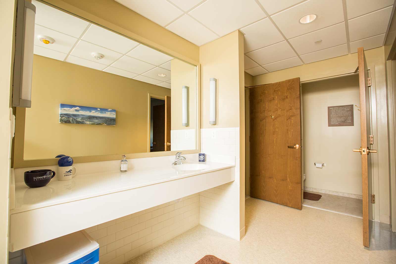 Restrooms in on-campus residence halls, with their wide countertops, are designed for ease and comfort.