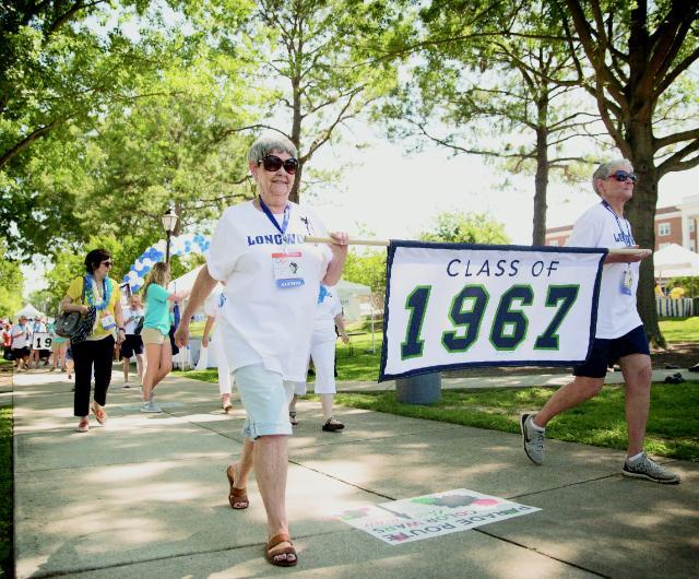 Anne Lancaster Hall ’67 (left) and Deedie Grimstead Cote ’67 lead their class from Stubbs Lawn to Iler Field for Alumni Color Wars. In honor of their 50th reunion, members of the Class of 1967 raised $904,636 over the last five years from 150 donors. Of that, $26,172 was used to endow a fund that will help area residents afford services provided by Longwood Speech, Hearing and Learning Services.