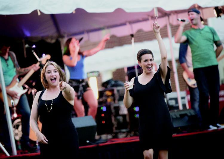 Megan Parker ’09 (left) and Colleen Whitney Nichols ’10 get the party started at the 2000s reception Friday.