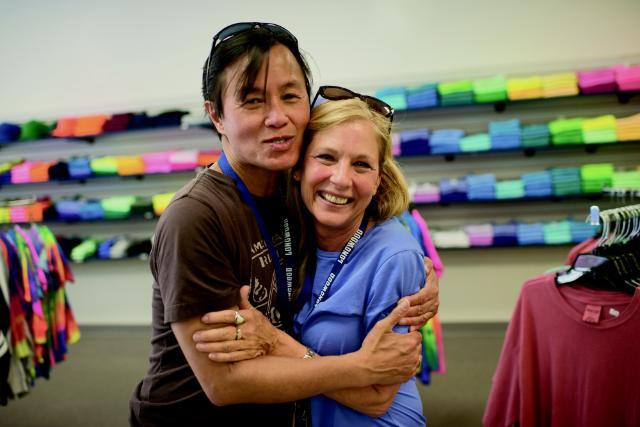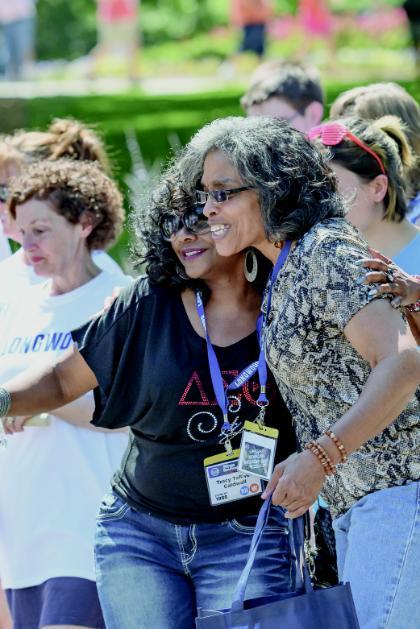 Tracy Tolliver Caldwell ’88 (left) and Queen Hardison-Lassiter ’82 reach across classes for a hug.