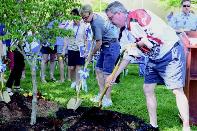 Stephen Wertz ’88 and Suzanne DuBose ’83 help plant a tree as part of a Sunday memorial service to remember Longwood alums who died in the last year.