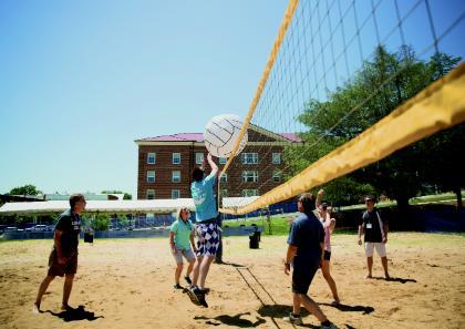 The ‘mega’ theme carries over into an oversized volleyball game on Stubbs Lawn.