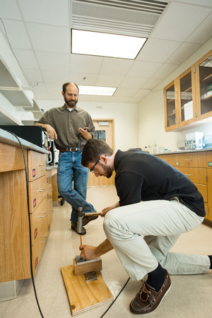 Jonathan Buckley ’16 slams an odd-looking hammer onto the head of a hole punch.