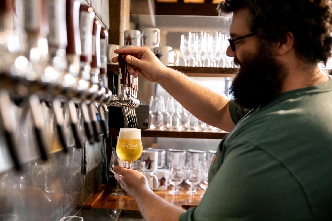 Mandeville has been at Fine Creek since 2019. He was drawn to the small scale of their production—they brew 100 gallons at a time and produce about 400 barrels annually. The majority of their beer is consumed on site.