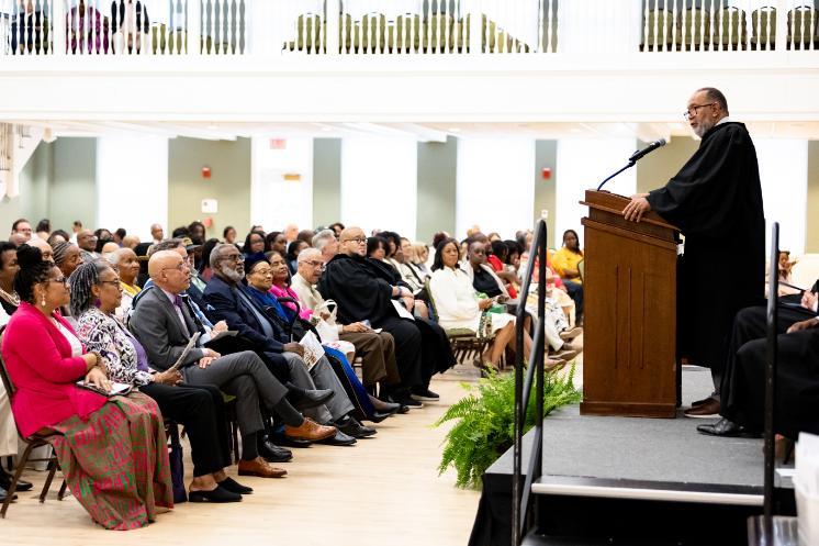 Provost and Vice President for Academic Affairs Dr. Larissa Smith, a civil rights historian and longtime liaison to the Moton Museum, read the names of honorees who received an honorary juris doctor diploma, beginning with those who could not make the ceremony, but many of whom were watching via livestream.