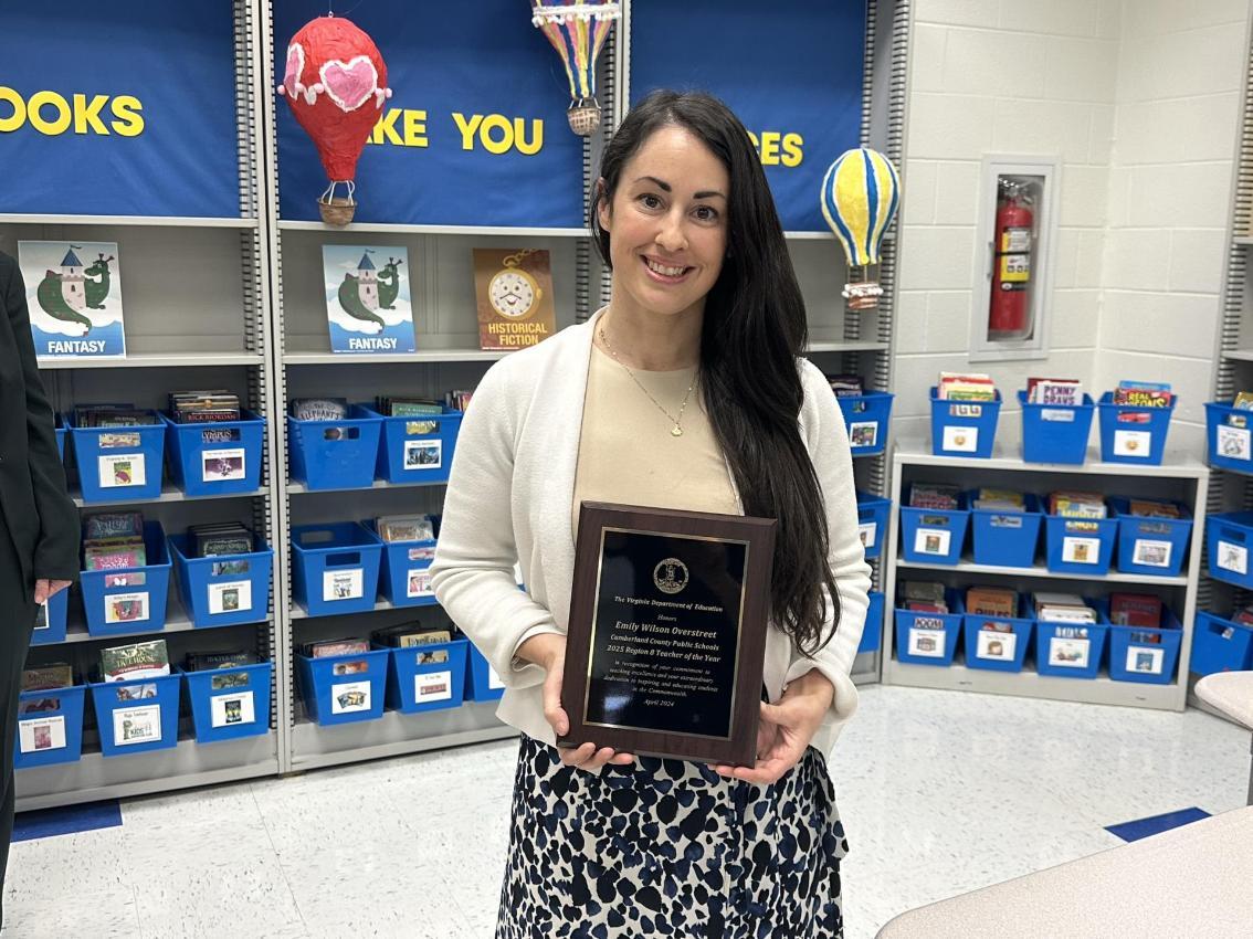 In lauding the Region 8 winner, Virginia Superintendent of Public Instruction Lisa Coons described Overstreet as a strong advocate for educators and for arts education. Region 8 includes 12 school divisions in central and Southside Virginia, including Cumberland and Prince Edward.