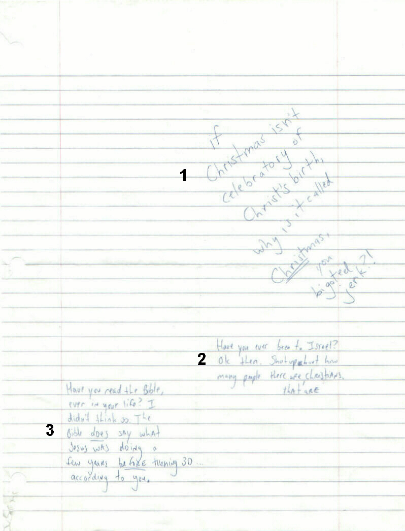 Now to address each of the student’s concerns:1 My comment about Christmas had nothing to do with the fact that it celebrates the birth of Jesus but why it is celebrated on December 25. I love Christmas and celebrate it vigorously. If the student had bothered to listen to what I said, he/she would realize that I was pointing out that Christianity developed within the context of the Roman Empire and that while Christmas commemorates the birth, the fact that it is celebrated on December 25 has nothing to with when Jesus was born. Christmas is a celebration of a new light in the world; I can’t think of a better time to celebrate that than after the winter solstice (the setting for the Roman Saturnalia Festival). The actual time of year that Jesus was born is of little consequence to Christianity in general. Christmas commonly was not celebrated at all until recent centuries and even was outlawed in colonial New England for a time. Also, while the “jerk” part may be a matter for debate, I am a Christian, so I fail to understand where the bigotry comes in.