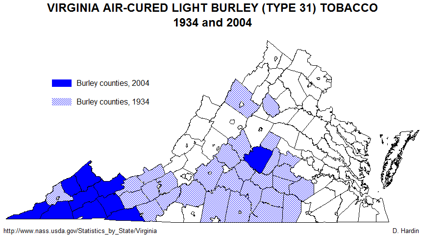 The map below shows the extent of sun-cured tobacco production in 1934 and it's meager remnant in 2004. Sun-cured tobacco may be the least important today, but it once ruled the Virginia economy. Sun-cured tobacco is a dark air-cured variety that I believe is the descendant of the tobacco known as "sweet-scented" during the colonial period. Most of the historic range shown in the green diagonal pattern conforms perfectly with the sweet-scented subregion that originated in the dark loamy soils along the lower James River, the York and its tributaries, and the Rappahannock River. All Virginia tobaccos originate in the same stain of tobacco - Nicotiana tabacum - imported from the Orinoco River Basin of northern South America. It is a very versatile plant and can grow in many different environments. Not long after John Rolfe successfully introduced tobacco production to Virginia, planters discovered that when tobacco was shifted away from the river bottoms and ventured into sandy soils found closer to the ocean or clay soils in the high necklands and piedmont, their tobacco was not as dense and aromatic as in the sweet-scented areas. Sweet-scented became the preferred smoking tobacco in Britain and it usually brought much greater profits to sweet-scented producers. Where sweet-scented could be grown, great fortunes arose, which also meant that the sweet-scented area was the center of the plantation economy and had the highest density of African slave labor during the colonial period. Strangely, by about 1800 the term "sweet-scented" tobacco disappears, even though a great deal of tobacco was still being raised in the traditional sweet-scented areas. What makes sun-cured tobacco a likely candidate as heir to the sweet-scented legacy? First, it is a dark tobacco, just like sweet-scented. Second, it is cured in the same manner as sweet-scented was during the colonial period: by cutting the whole stalk, setting the cut plants out to dry in the sun, and by hanging the entire plant for air-curing. Third, it still is prized as a pipe tobacco in Europe. It is a shame that it is nearly extinct. After 2004, so few farmers were growing it that disclosure laws prevent a county-by-county analysis of where it is still being grown. There were only seventy acres devoted to it in all of Virginia in 2005.