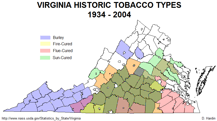 The map below shows the state-wide extent of tobacco production from 1934 to 2004. These are all the counties that reported different types of tobaccos being produced back to 1934. It becomes a bit of a jumble in south-central Virginia because so many types of tobacco historically have been grown there. There has been a great degree of sorting out, such that today sun-cured is found only in an arc around Richmond, burley is confined almost exclusively to southwest Virginia, and flue-cured and fire-cured tobaccos are interspersed in Southside Virginia. Keep in mind that during the colonial period there were literally no counties in Virginia (excluding the future territory of West Virginia) that didn't grow tobacco!