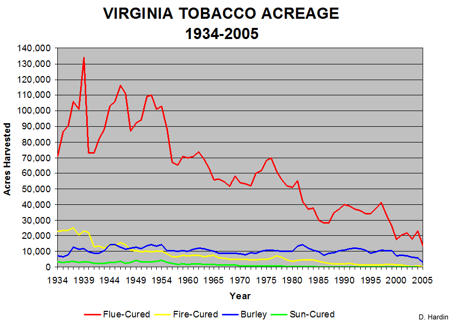The tour of the Glascock's tobacco farm was fantastic and I hope that you found it as educational and as enlightening as I did. Joe Enedy will be providing you with a collection of images and videos that I took on two previous visits which show the greenhouse in full leaf and the plant setting process. What I'm adding here are maps and graphs showing both historical and geographical trends in Virginia tobacco production. Commentary for each of the graphs and maps will follow, so check back here for interpretive comments as they are added.