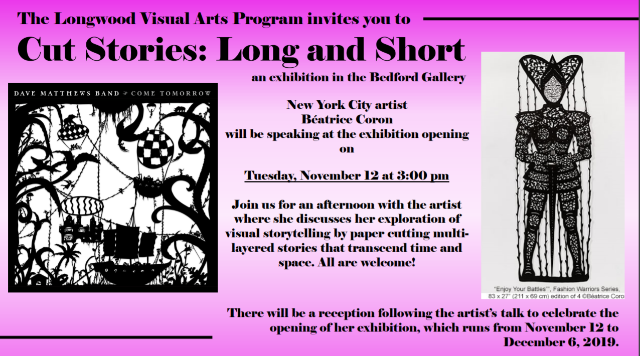 The Longwood Visual Arts Program invites you to attend an artist talk and exhibition by New York City-based artist Beatrice Coron. Join us for an afternoon with the artist where she will discuss her exploration of visual storytelling by paper cutting multi-layered stories that transcend time and space. All are welcome!