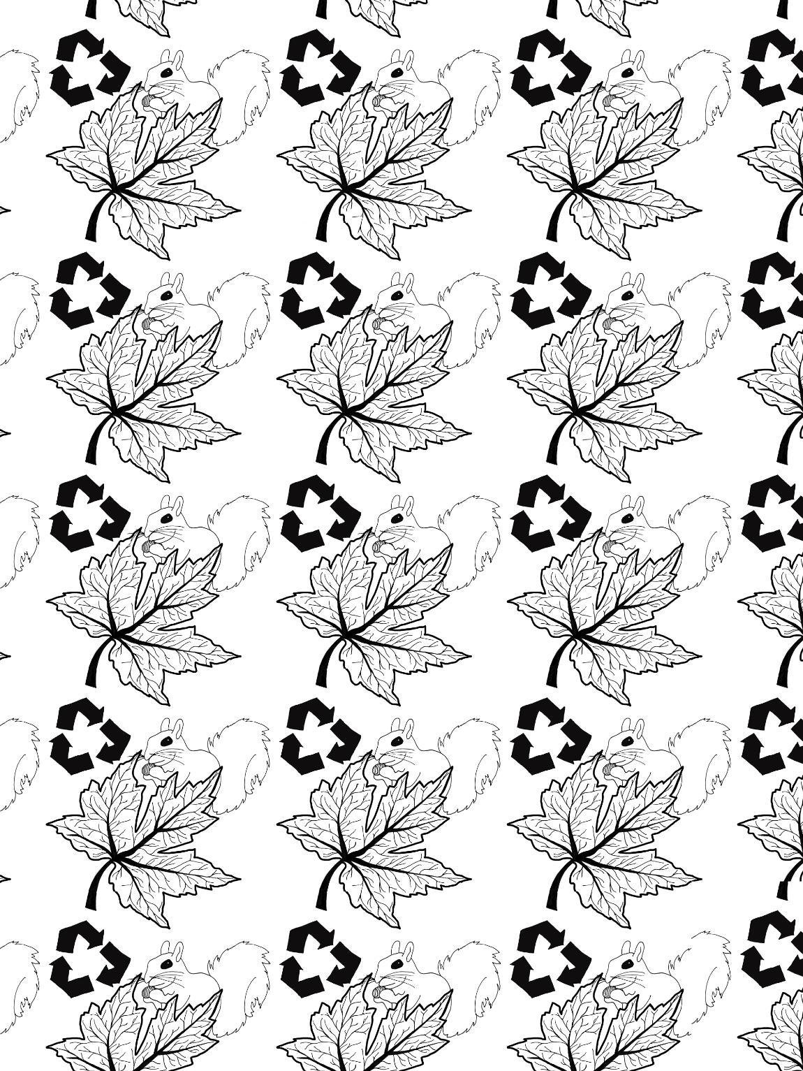 Student Art Work. Black-and-white repeating pattern featuring large detailed leaves, squirrels, and recycling symbols arranged in a diagonal grid across a white background.