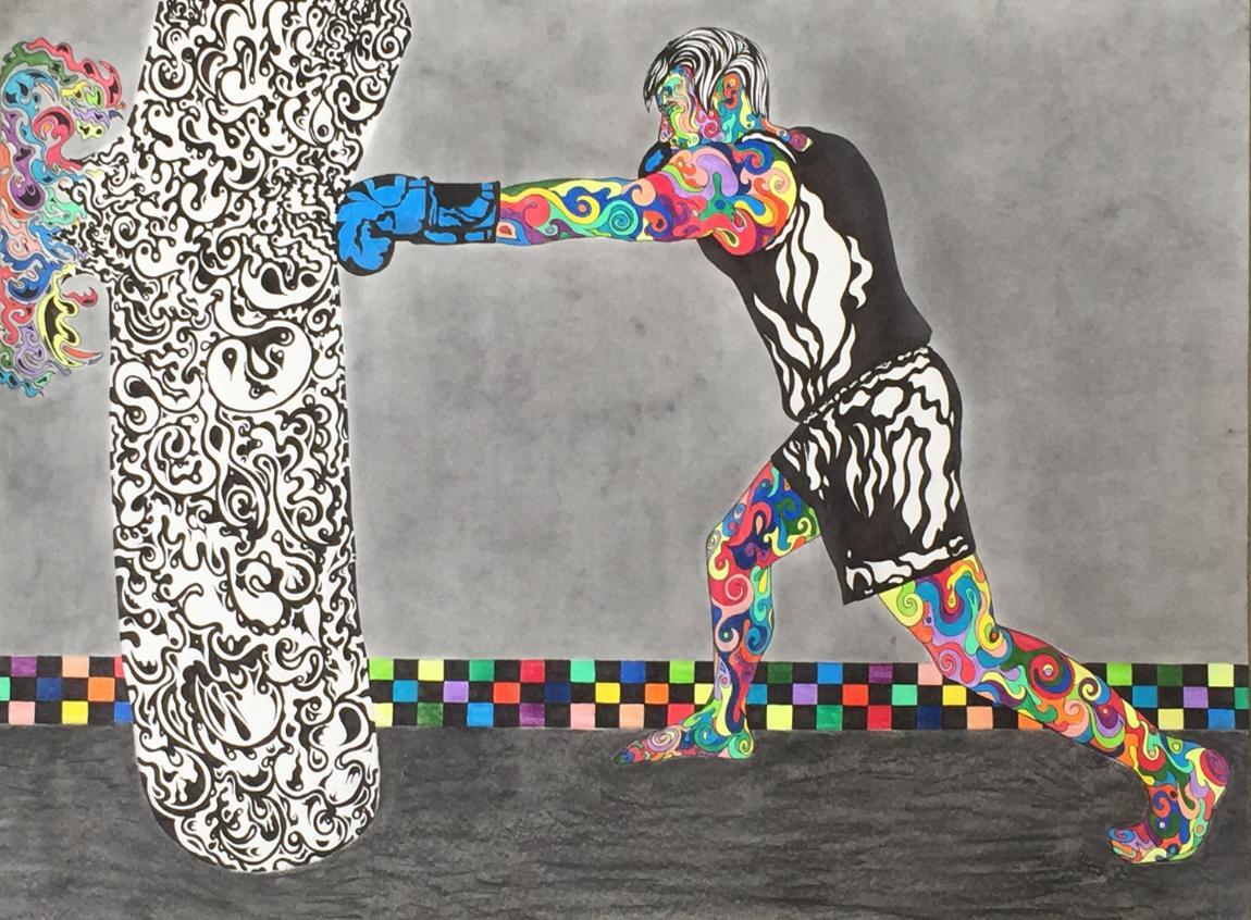 Student Art Work. Colorful illustration of a boxer striking a swirling black-and-white punching bag, with the boxer’s arms, legs, and face covered in vibrant, multicolored patterns against a gray background with a checkered border.