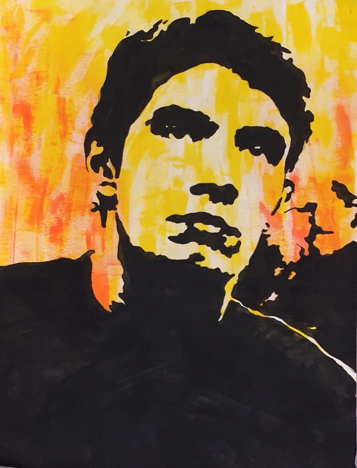 Student Art Work. Bold portrait painting of a man’s face and upper body in black silhouette with minimal details, set against a vibrant yellow and orange textured background.