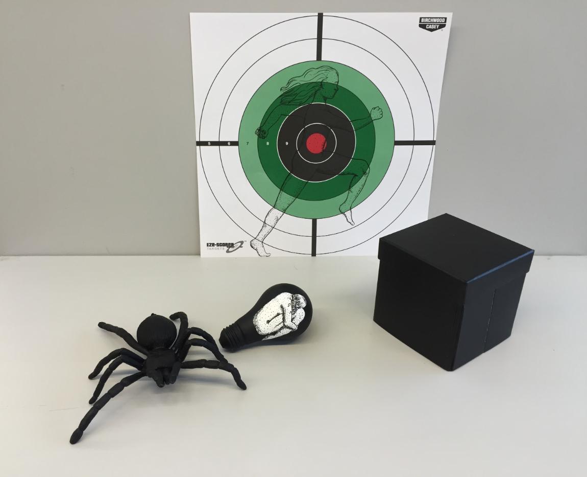 Student Art Work. Art installation featuring a green and black shooting target with a running figure, a large black spider sculpture, a black lightbulb with a white hand graphic, and a small black cube box arranged on a white surface.