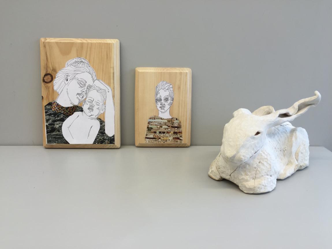 Student Art Work. Two mixed-media portraits on wooden panels featuring line-drawn figures with collage elements, displayed next to a textured white ceramic sculpture of a reclining rabbit with long ears.