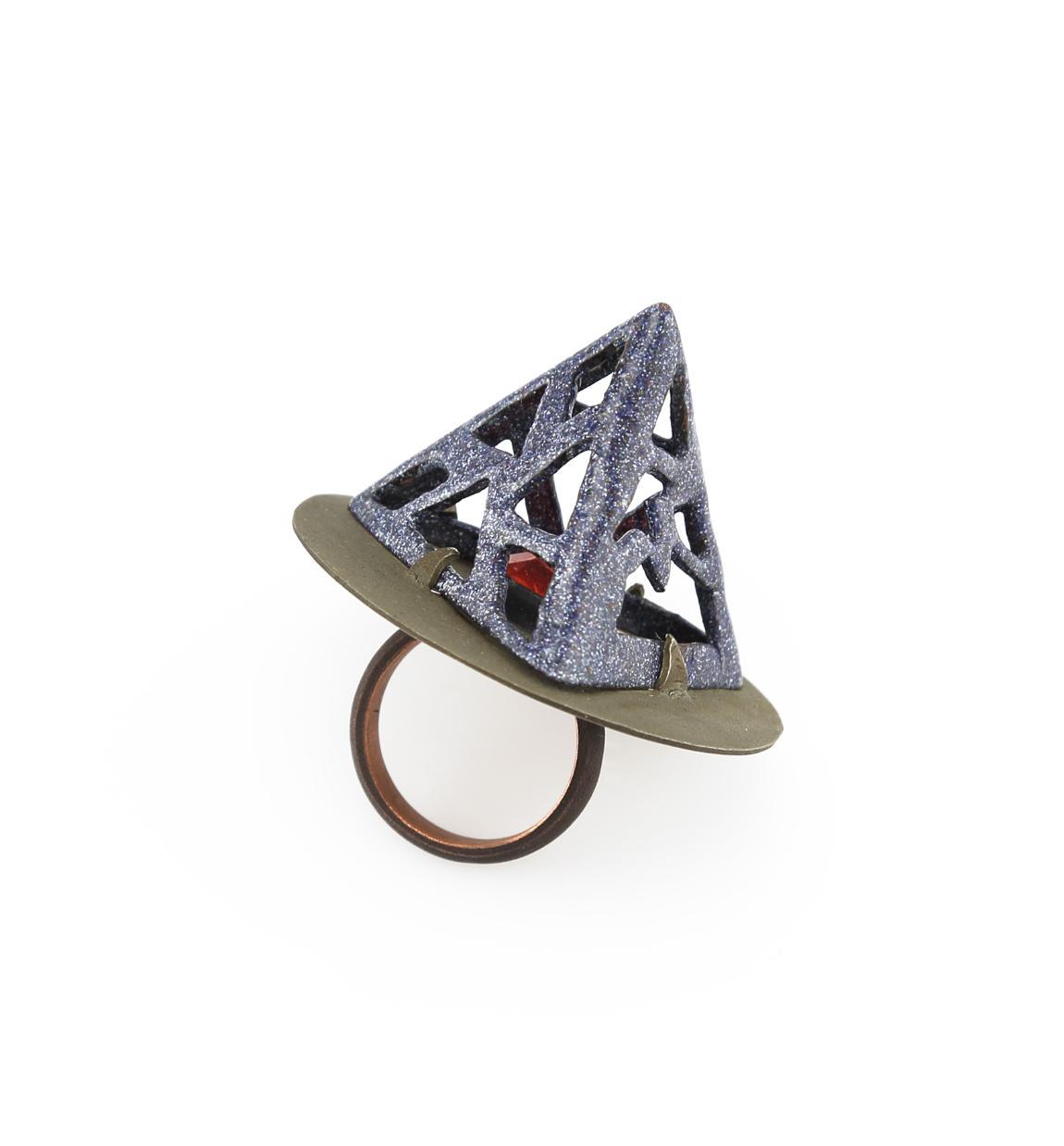 Student Art Work. Statement ring featuring a large metallic cone with cut-out triangular patterns in a glittery purple finish mounted on a flat circular base with a bronze band.