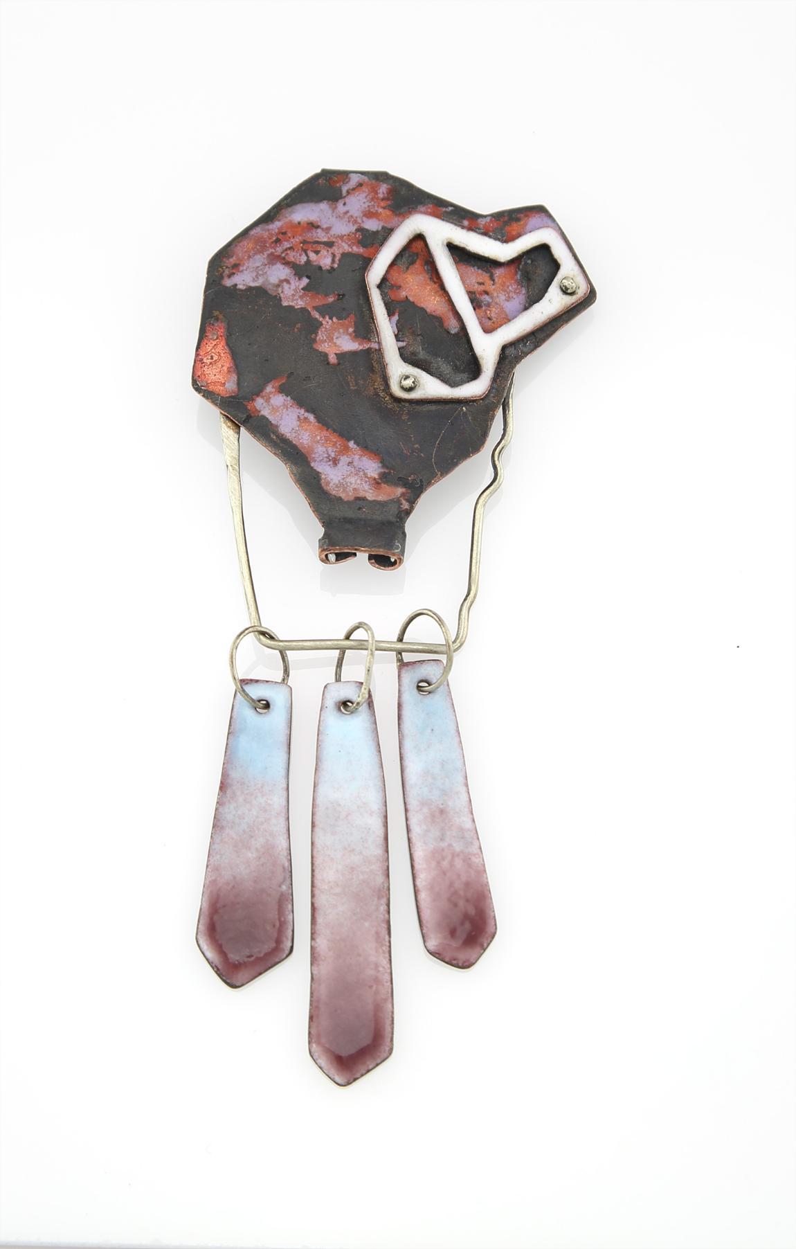 Student Art Work. Abstract mixed-metal brooch with an irregular dark red and purple top piece featuring a white geometric outline and three elongated gradient pendants in shades of blue and maroon hanging below.