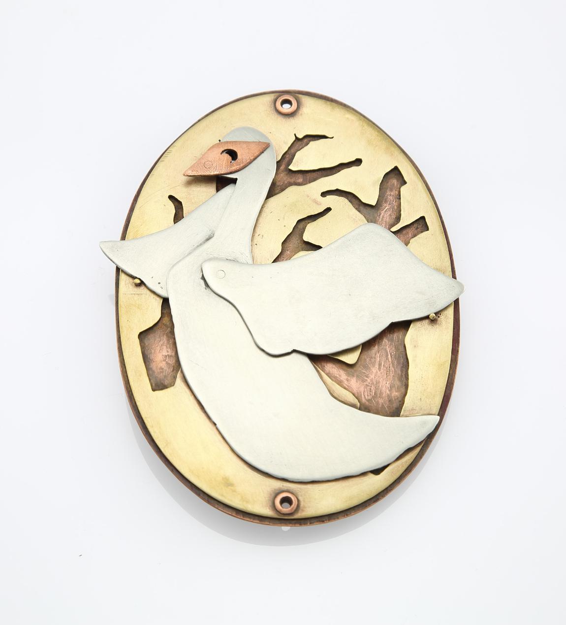 Student Art Work. Oval metal belt buckle featuring a layered design of a white bird with a copper beak flying in front of a cut-out tree silhouette on a brass background.