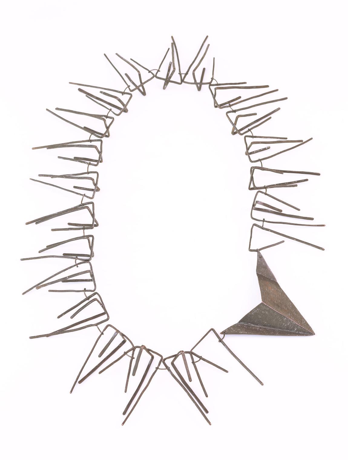 Student Art Work. Abstract metal necklace composed of angular wire shapes forming a spiky pattern around a central geometric triangular pendant.