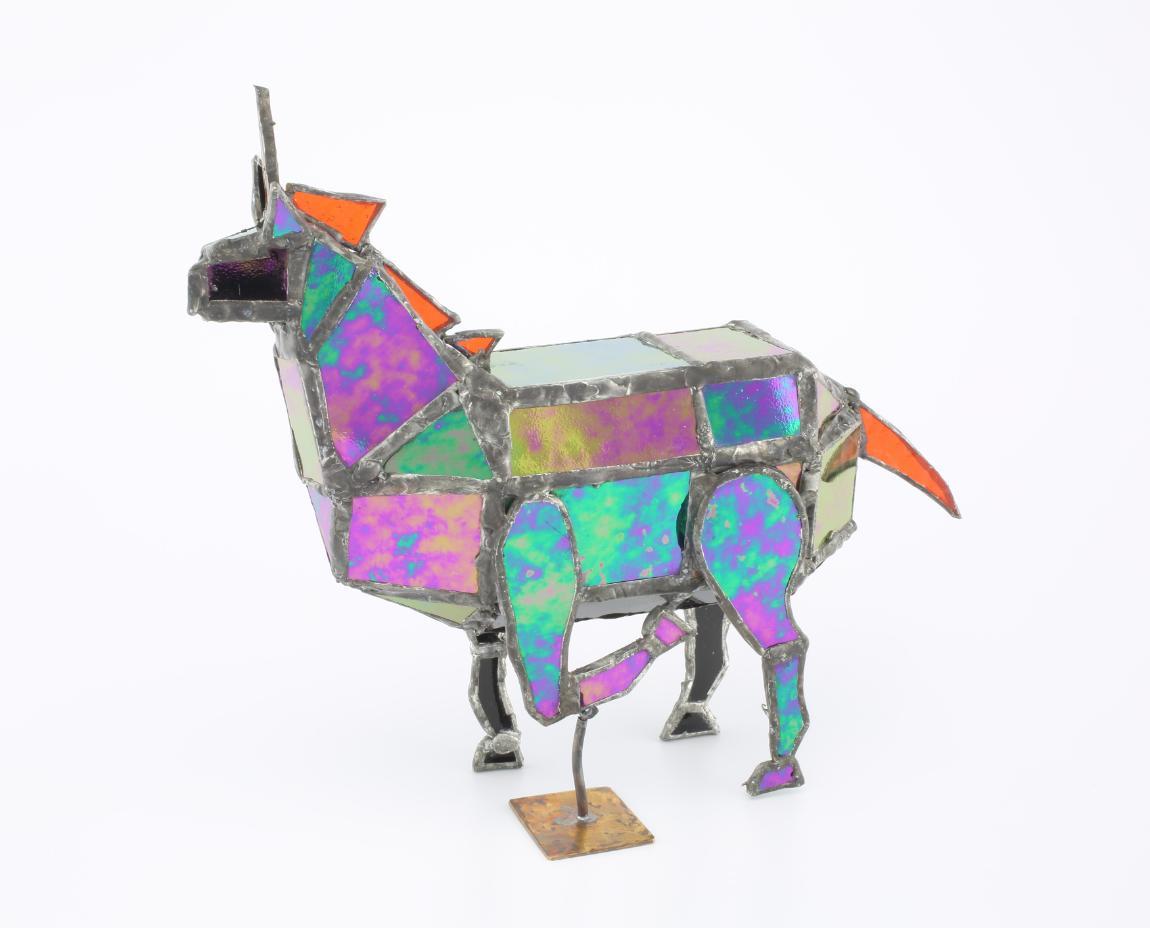 Student Art Work. Colorful stained-glass sculpture of a unicorn with iridescent purple and green panels, orange accents on the mane and tail, and a metal frame standing on a small square base.