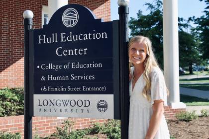 A powerhouse in the classroom and on the field, Maddie Hommey knows that meaningful connections drive both her education and her future career. MaddieHommey stands next to the Hell Education Center sign.  - A smiling woman in a white dress stands beside the Hull Education Center sign on Longwood’s campus. Sunlight highlights her long blonde hair as she poses next to the black and white sign. Brick walls, columns, and greenery frame the background. The scene feels bright and welcoming outdoors.