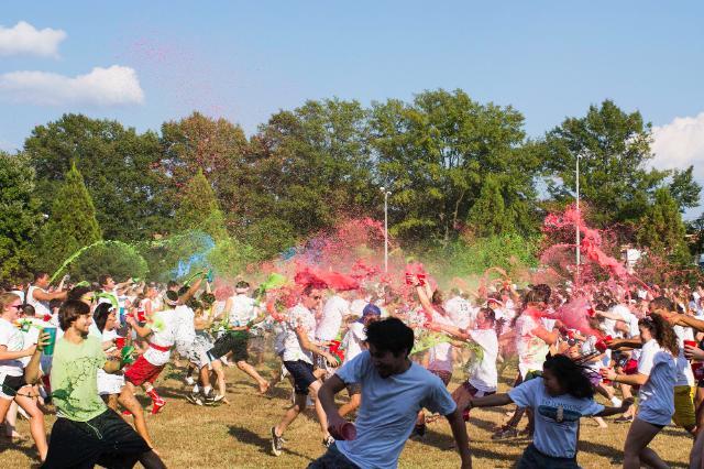 Sound fun? It is. Students who enter in odd years are green, even years are red, and it really doesn’t matter who gets the most paint on the other class because red+green=blue!