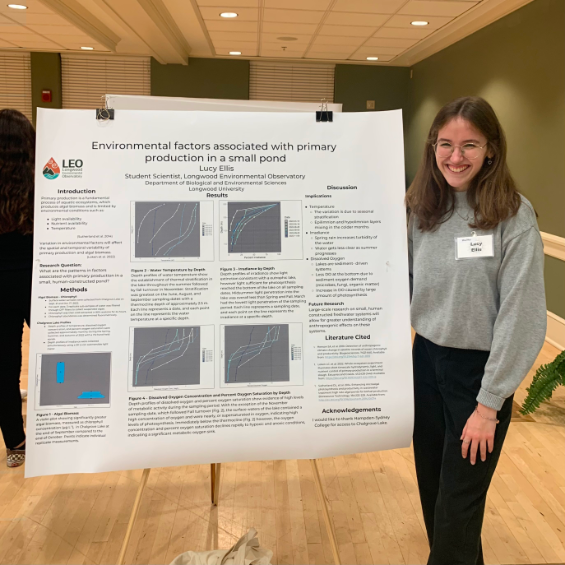 Lucy Ellis, a sophomore at Longwood University, is majoring in Environmental Science with a concentration in Life Science. Lucy also has a minor in Geographic Information Science and is a member of the Cormier Honors College for Citizen Scholars. Lucy is conducting her research as part of the Longwood Environmental Observatory (LEO) with her faculty mentor, Dr. Kenneth Fortino. Lucy’s research is focused on the environmental factors associated with primary production in a small human-constructed pond.