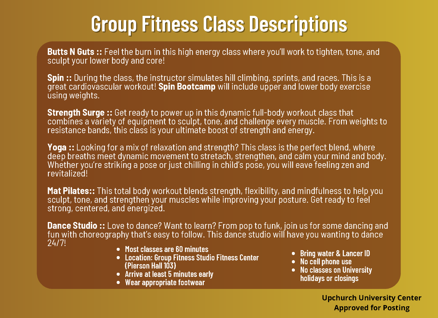 Our qualified staff provides a safe, fun, and effective environment and welcomes participants regardless of age, gender, or fitness level. We are dedicated to providing diverse exercise opportunities to the campus community and with about 13 classes offered each week, there is sure to be one to help you reach your fitness goals. Class formats range from low-intensity classes like Yoga to higher intensity Bootcamp classes, so be sure to check out all class descriptions.