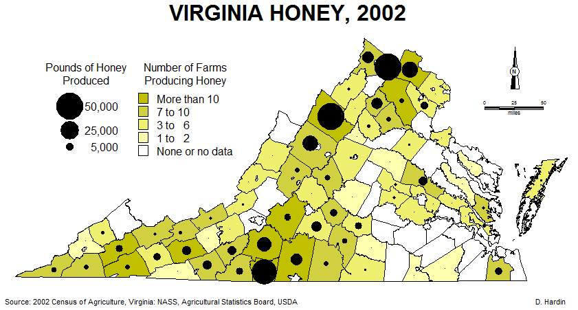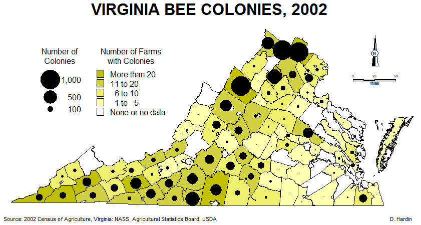 Virginia Bee Colonies, 2002 - Map of the number of colonies and number of farms with colonies of bees