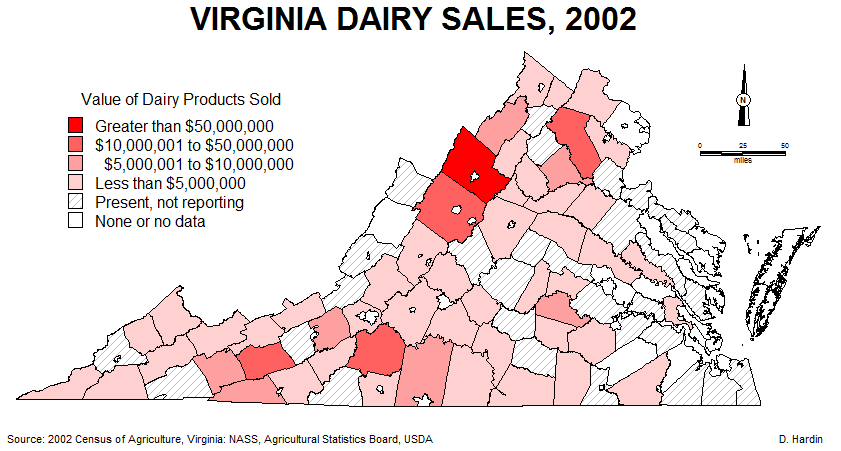 Virginia Dairy Sales, 2002 - Map of the value of dairy products sold