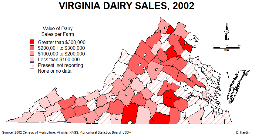 Virginia Dairy Sales, 2002 - Map of the value of dairy sales per farm