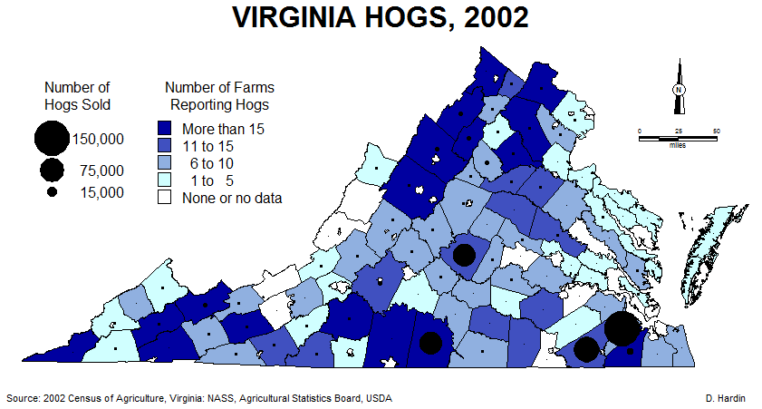 Virginia Hogs, 2002 - Map of the number of hogs per farm