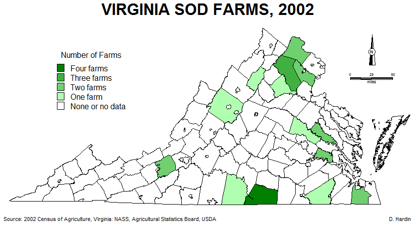 Virginia Sod Farms, 2002 - Map of the number of farms with sod