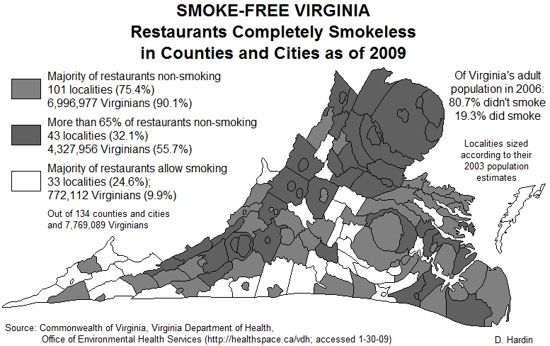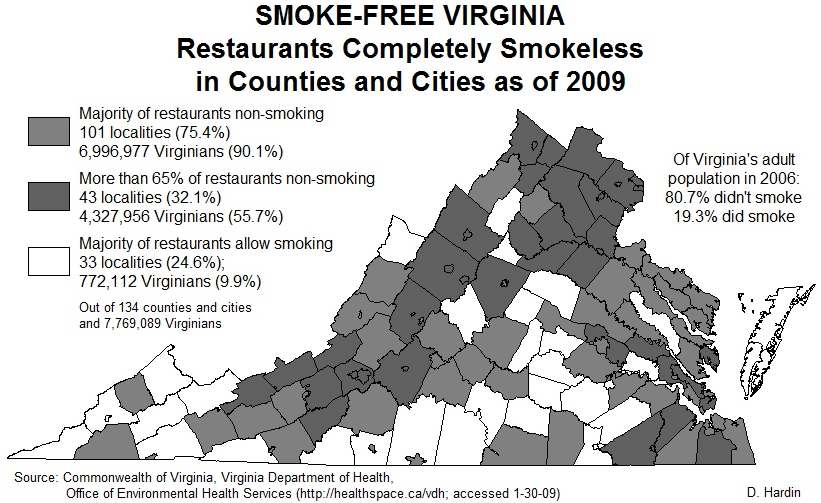 1Virginia Department of Health (VDH), Office of Environmental Health Services (OEHS), "Commonwealth of Virginia, Non-smoking establishments" (http://www.healthspace.ca/vdh; accessed January 30, 2009).