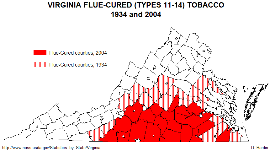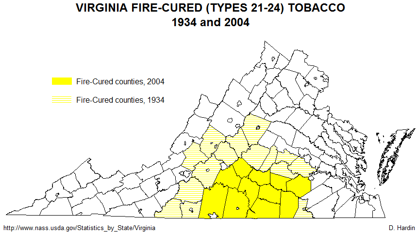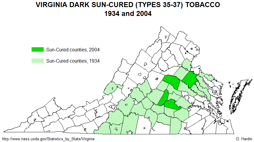 The map below shows the extent of sun-cured tobacco production in 1934 and it's meager remnant in 2004. Sun-cured tobacco may be the least important today, but it once ruled the Virginia economy. Sun-cured tobacco is a dark air-cured variety that I believe is the descendant of the tobacco known as "sweet-scented" during the colonial period. Most of the historic range shown in the green diagonal pattern conforms perfectly with the sweet-scented subregion that originated in the dark loamy soils along the lower James River, the York and its tributaries, and the Rappahannock River. All Virginia tobaccos originate in the same stain of tobacco - Nicotiana tabacum - imported from the Orinoco River Basin of northern South America. It is a very versatile plant and can grow in many different environments. Not long after John Rolfe successfully introduced tobacco production to Virginia, planters discovered that when tobacco was shifted away from the river bottoms and ventured into sandy soils found closer to the ocean or clay soils in the high necklands and piedmont, their tobacco was not as dense and aromatic as in the sweet-scented areas. Sweet-scented became the preferred smoking tobacco in Britain and it usually brought much greater profits to sweet-scented producers. Where sweet-scented could be grown, great fortunes arose, which also meant that the sweet-scented area was the center of the plantation economy and had the highest density of African slave labor during the colonial period. Strangely, by about 1800 the term "sweet-scented" tobacco disappears, even though a great deal of tobacco was still being raised in the traditional sweet-scented areas. What makes sun-cured tobacco a likely candidate as heir to the sweet-scented legacy? First, it is a dark tobacco, just like sweet-scented. Second, it is cured in the same manner as sweet-scented was during the colonial period: by cutting the whole stalk, setting the cut plants out to dry in the sun, and by hanging the entire plant for air-curing. Third, it still is prized as a pipe tobacco in Europe. It is a shame that it is nearly extinct. After 2004, so few farmers were growing it that disclosure laws prevent a county-by-county analysis of where it is still being grown. There were only seventy acres devoted to it in all of Virginia in 2005.