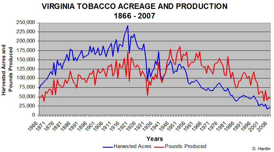 The graph below is an overall view of land in tobacco and pounds produced in Virginia from 1866 to 2007. Harvested acreage is in blue and pounds produced is in red. Something to keep in mind here is that those two statistics also get you to yield per acre, which is a measure of the efficiency of tobacco operations. When acreage exceeds production, efficiency is low; when production exceeds acreage, efficiency is high and there is a greater yield per acre. Several things to note here: first is the obvious rise in both acreage and production after the Civil War, but with low yields (read: inefficient methods); second, note the precipitous decline in acreage and production during the 1920s and 1930s, which was caused by the effects of the Great Depression and the African-American exodus from the South, which in turn triggered the federal government's allotments (controlling acres planted), auction systems, and price supports; third, note how production and acreage increased in the 1940s and 1950s - albeit never reaching pre-Depression levels - and that production begins to exceed acreage, indicating more efficient farming methods - primarily through the use of machinery (which replaced farmhands and in part fueled the emigration of African-Americans).