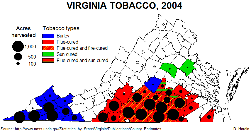 The tour of the Glascock's tobacco farm was fantastic and I hope that you found it as educational and as enlightening as I did. Joe Enedy will be providing you with a collection of images and videos that I took on two previous visits which show the greenhouse in full leaf and the plant setting process. What I'm adding here are maps and graphs showing both historical and geographical trends in Virginia tobacco production. Commentary for each of the graphs and maps will follow, so check back here for interpretive comments as they are added.