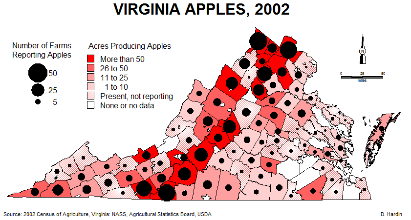 Virginia Apples, 2002 - Map of apple trees as a percentage of all land in orchards