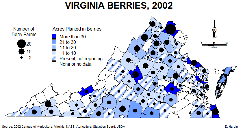 Virginia Berries, 2002 - Map of the number of farms producing and acres planted in berries