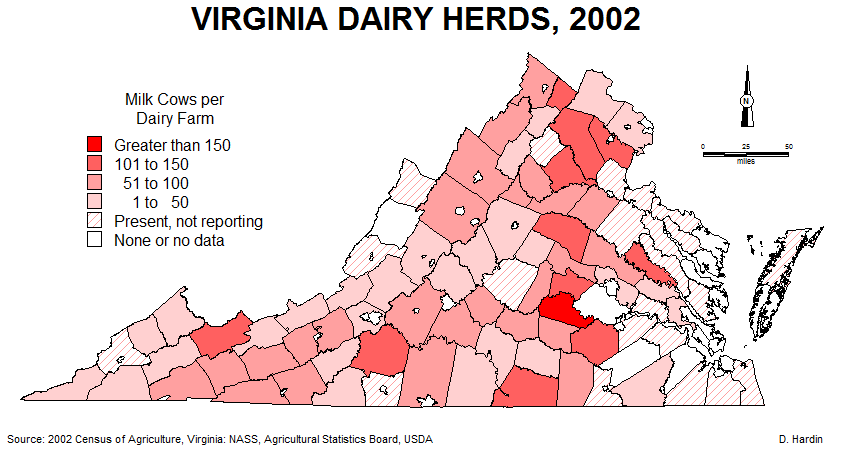 Virginia Dairy Herds, 2002 - Map of the number of milk cows per dairy farm