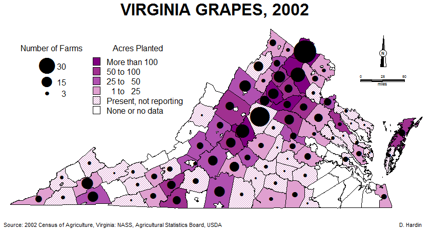 Virginia Grapes, 2002 - Map of the number of farms planting and acres planted in grapes