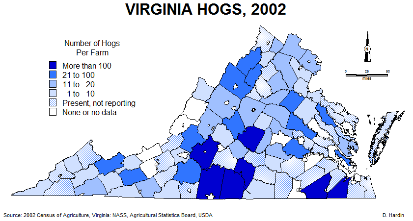 Virginia Hogs, 2002 - Map of the number of hogs per farm