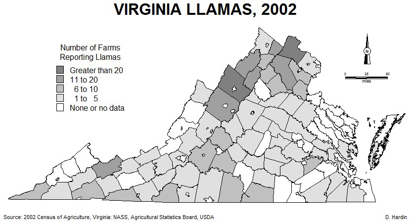 Virginia Llamas, 2002 - Map of the number of farms reporting llamas