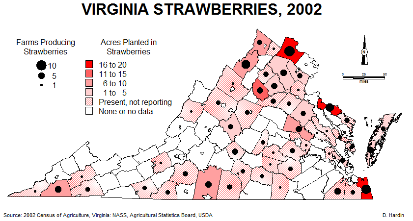 Virginia Strawberries, 2002 - Map of farms producing and acres planted in strawberries