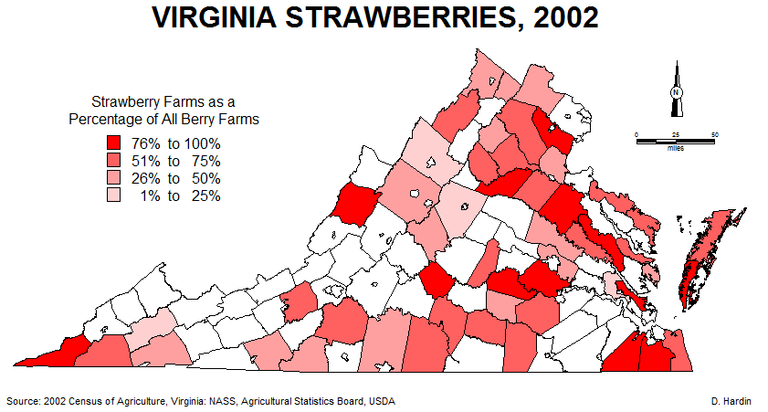 Virginia Strawberries, 2002 - Map of strawberry farms as a percentage of all berry farms