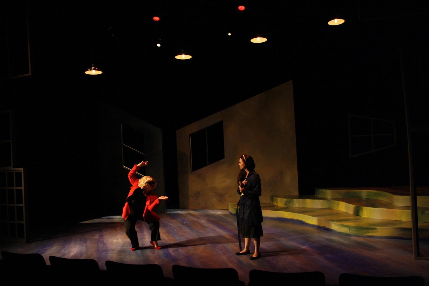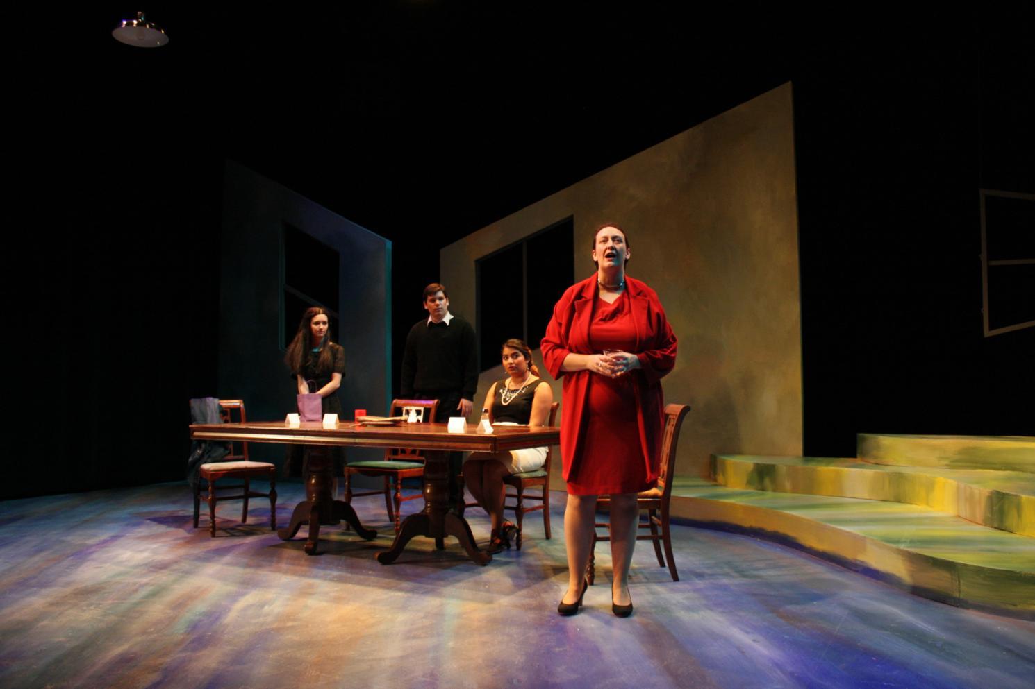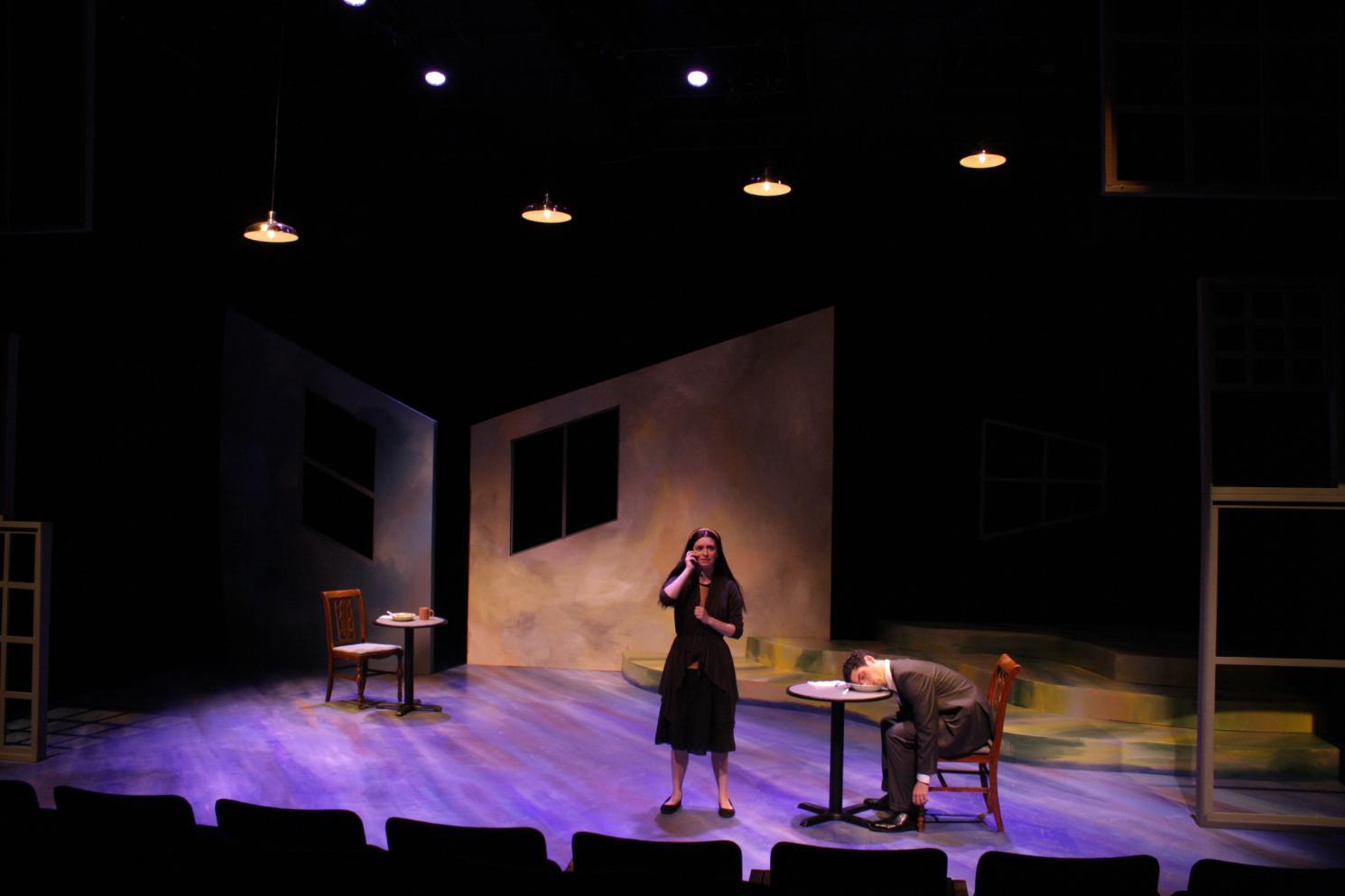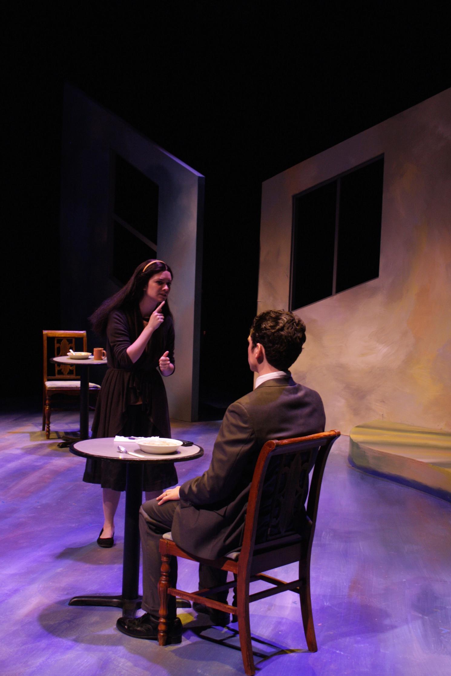 LU actors perform Deadman's Cell phone - Actors speak at a table, the male actor is seated and the female actor is standing