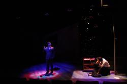 LU actors perform Deadman's Cell phone - three actors on stage - two actors kiss and one stands and speaks to the a audience