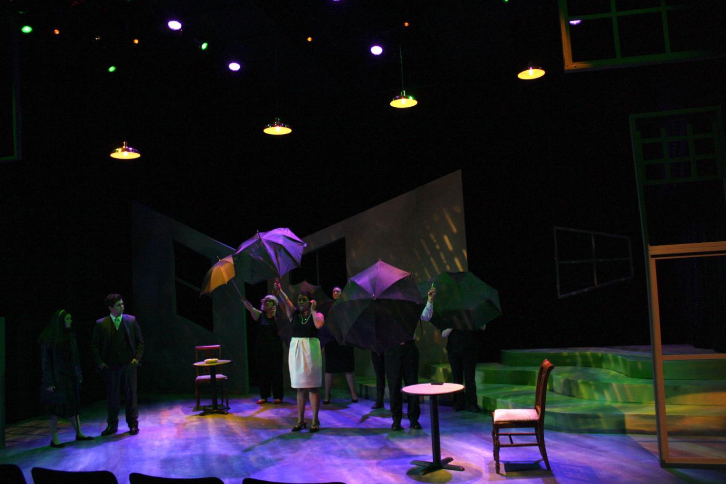 LU actors perform Deadman's Cell phone - Actors seated at a table and one stands, faces the camera and speaks