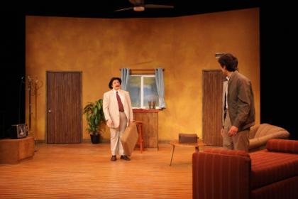 LU students perform A Masterpiece of Comic...Timing! for 2018-2019 season. Two student actors are having a conversation. One of the actors is sitting on the couch. His face can't be seen. The second actor is standing in front of the first actor. His right arm is holding multiple objects against his chest while left arm in an a notebook that sits on a tall chair.